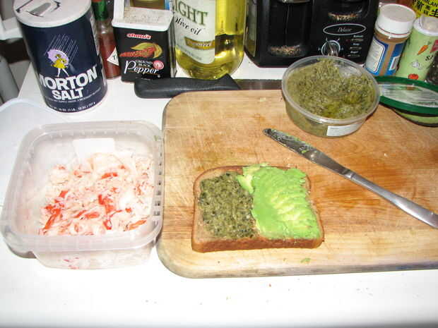 Ahora a poner las extensiones en el sándwich. Pesto en una mitad y el aguacate en la otra es lo que yo he elegido aquí - ya que estoy haciendo 1/2 de un sándwich, esto asegurará la cobertura total a lo largo de la experiencia de comer.