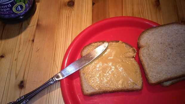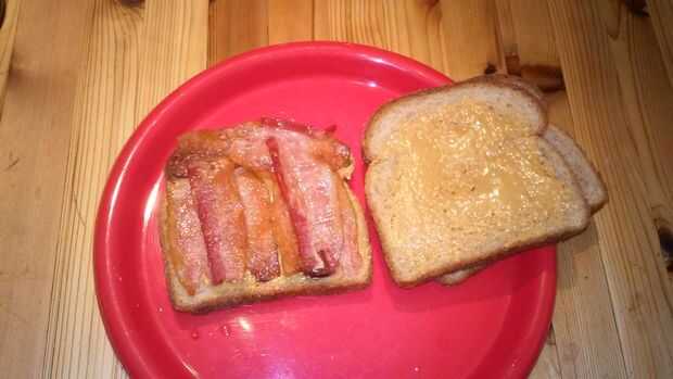 Tomar tres rebanadas de pan aplicar mantequilla de cacahuete en una rebanada, jalea a la otra y poner el tocino en allí.