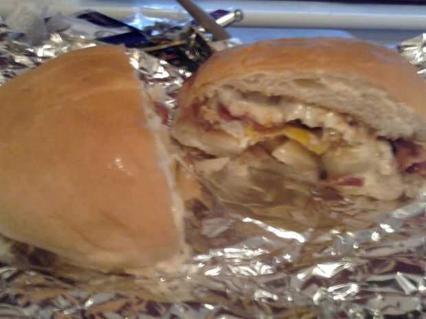 Mezclar la remolacha rallada, la manzana y la cebolla roja y de la mezcla en el yogur o mayonesa. De la pila en la parte superior de la carne, a continuación, junto con la rebanada restante de pan de emparedado