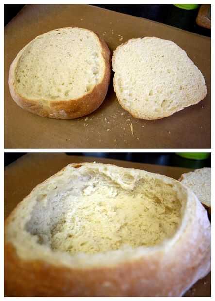 Una "tapa" de la parte superior del pan de la rebanada y sacar la mayor parte del pan dentro. Si usted consigue un poco llevado lejos con la sensación de sacar con pala y hay cualquier punto débil, puede parchear para arriba con algunos del pan que has sacado.