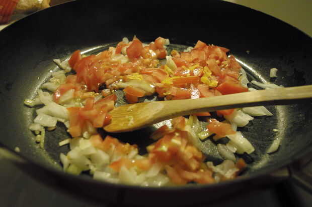 Luego agregar el tomate y la guindilla. Dejar cocinar por unos 5 minutos. Podría añadir un puré de tomate de sabor más intenso del tomate.
