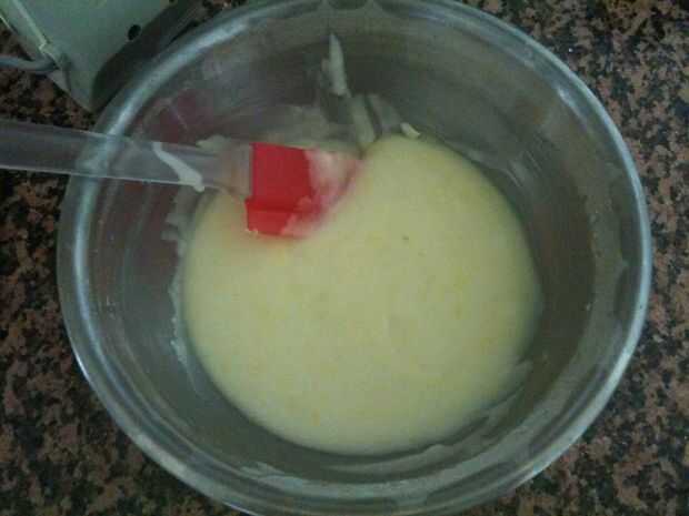 Batir 1 taza polvo de azúcar, 2 cucharaditas de margarina o mantequilla, ablandar, 1 cucharadita ralladura de cáscara de limón y 1 cucharada más 1 1/2 cucharaditas de limón jugo.