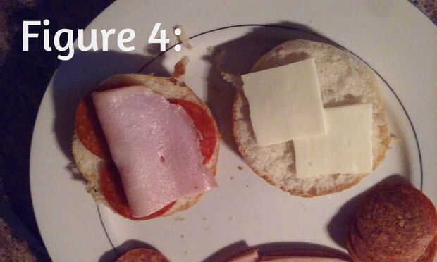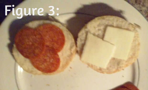Tome tres rodajas de pepperoni y colóquelos en la parte inferior de la galleta (ver figura 3).