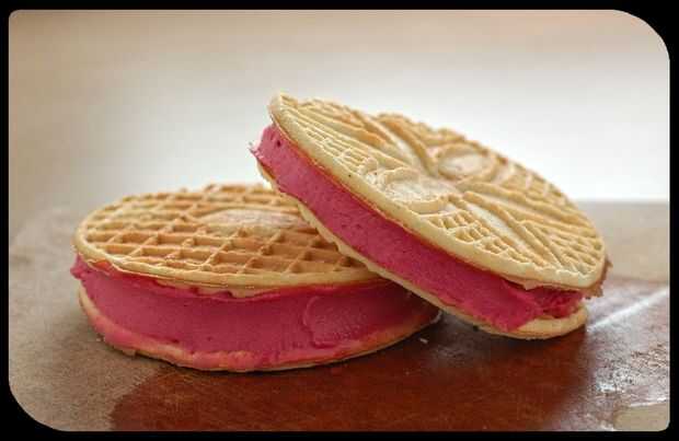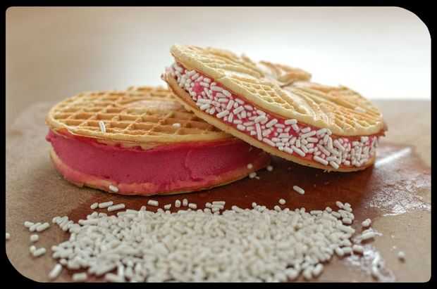 Suavemente presione (muy suavemente!) el trozo de helado entre dos pizelles. Cuando que usted consigue abajo a los últimos 2 o 3 más pequeños, será fácil que presionan para que los sándwiches están llenos. Ejecutar el dedo o una cuchara a lo largo de los bordes para suavizarlos y añadir sprinkles si desea un poco más de color y diversión.