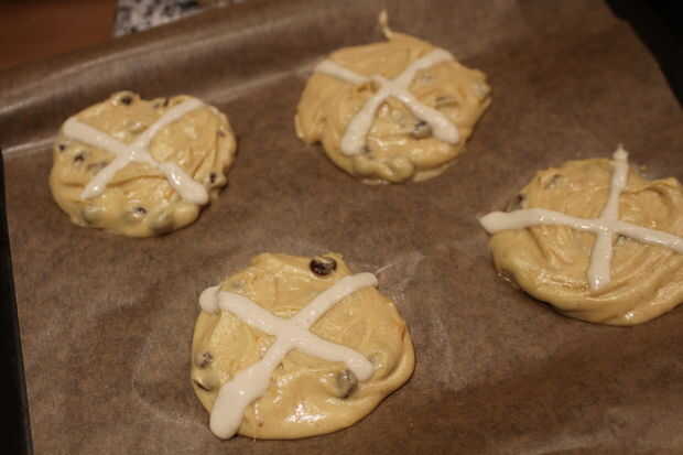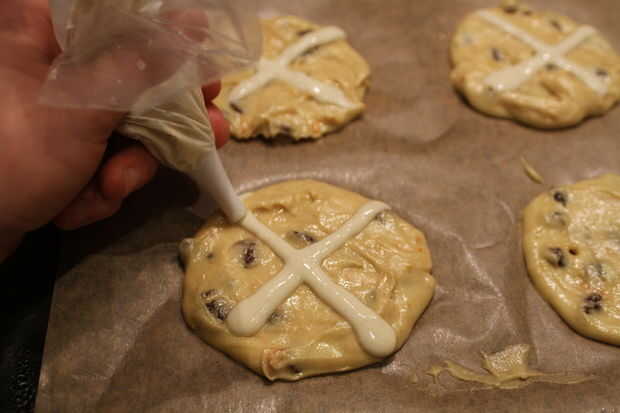 - Mezclar 2 cucharadas de harina con 2 cucharadas de agua fría a una pasta espesa y la cuchara en una manga pastelera con una boquilla redonda pequeña (o una bolsa de sándwich con una esquina de 2 mm cortada). Tubería cruza en medio de las cookies.