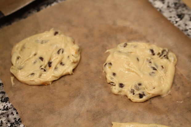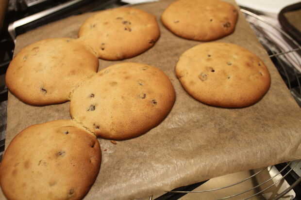- Cubierta para hornear hojas de papel parafinado y extender cucharadas colmadas de masa en círculos de aproximadamente 8cm/3 in de diámetro. Las cookies se propaga cuando al horno, así que deja mucho espacio entre los círculos de masa