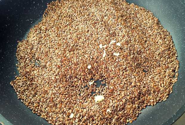 Ahora es el momento para exprimir el ajo, vierta una pizca de sal y especias. Cocinar durante pocos minutos, pero reduzca el calor para evitar la quema de semillas de lino.