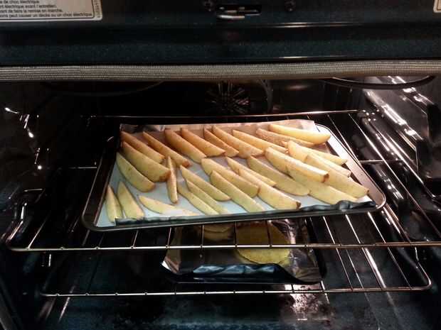 Comience primero las cuñas colocando la piel hacia abajo en una placa para horno. Ellos no hornear durante 30 minutos (comprobar con un cuchillo para ver cuando son oferta) necesidad de girar o voltear; Dejarlos hornear lejos! ¿Fácil eh? : P