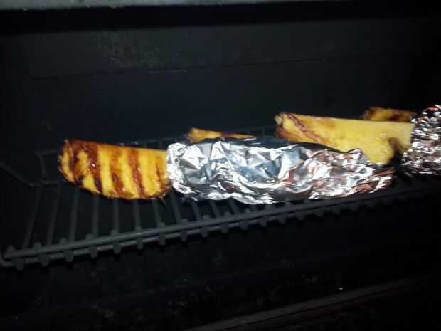 Tratar la piña de la misma manera. Después se doran de ambos lados, la pongo parte de la corteza en la parrilla.