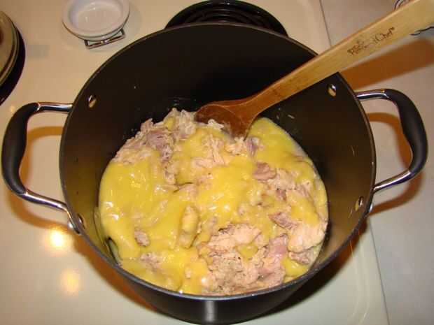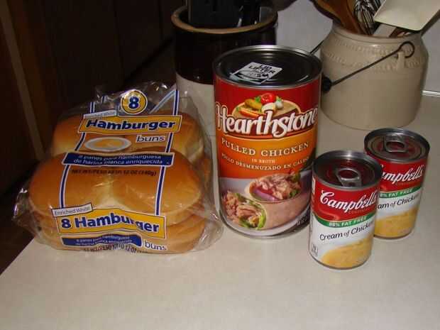 Yo uso el pollo enlatado que está disponible en el distribuidor de alimentos por menor local. Se 48 onzas, y el pollo en caldo. El sólo otro ingrediente que se cocine con es crema de sopa de pollo.
