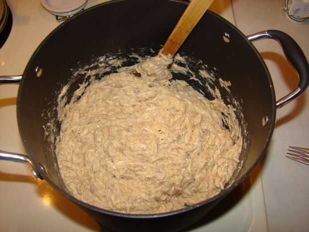 El pollo y la sopa sólo se vierten en una olla sobre fuego medio. Después de que la mezcla comience a hervir, reduzca el calor a fuego lento. Mientras se cocinan los pedazos más grandes de pollo se descomponen. Los trozos grandes que siguen pueden descompuestos con la cuchara que se utiliza para revolver. Está listo para servir después de hervir a fuego lento durante unos 15 minutos.