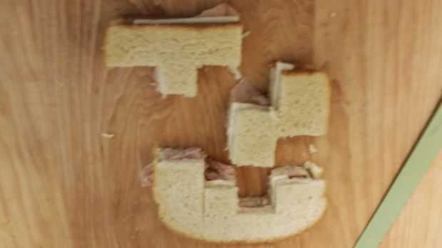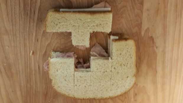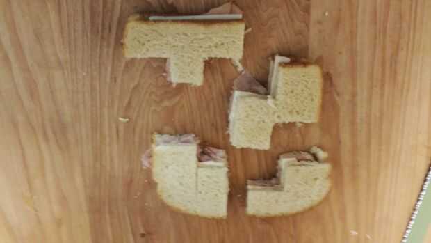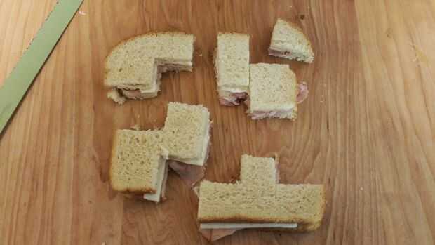 Tenga en cuenta las piezas de Tetris como ven como usted cortar los sándwiches. La T, la S, la L y el largo bar. No podrás hacer el puzzle de todos ellos, pero usted puede conseguir más en un solo sándwich.
