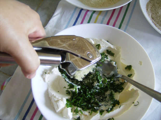 Mezclar queso crema con prensado diente de ajo y perejil.