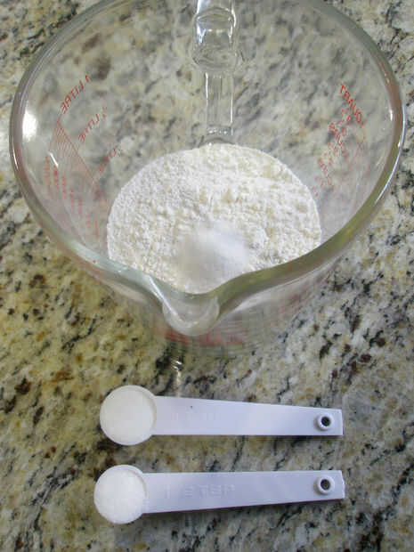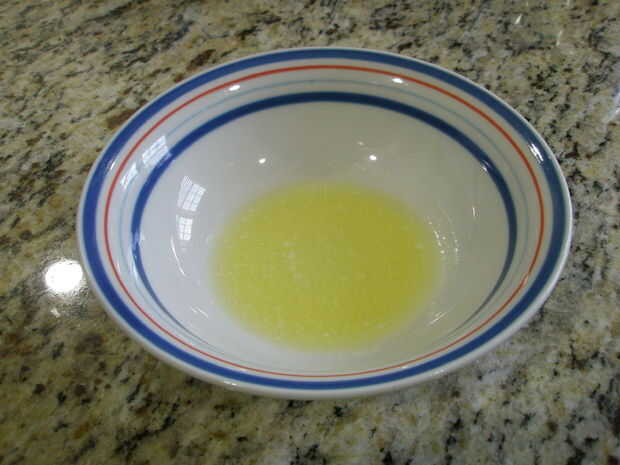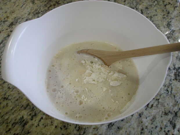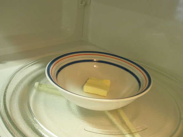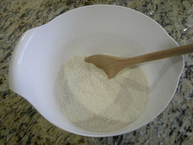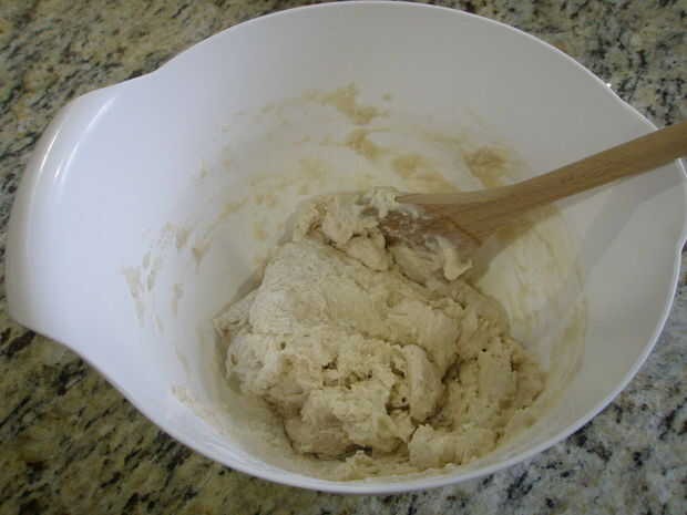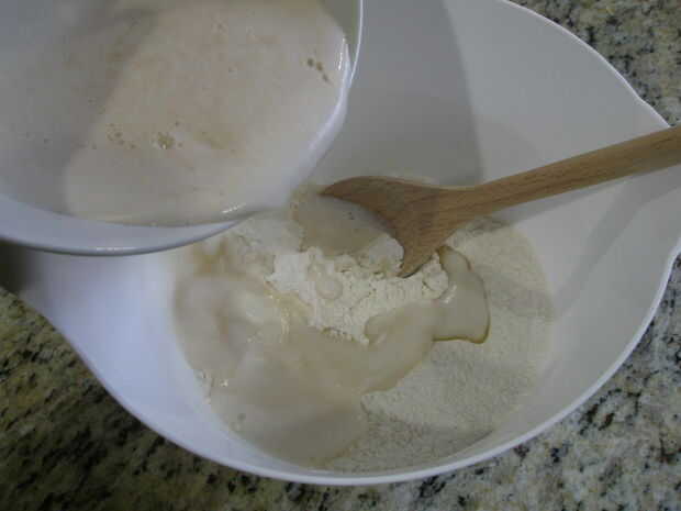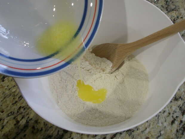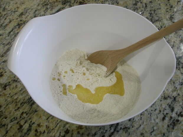 Derretir la mantequilla/margarina/manteca en el microondas y añadir a la mezcla de harina. Luego añadir la mezcla de levadura. Revuelva hasta que forma una masa.