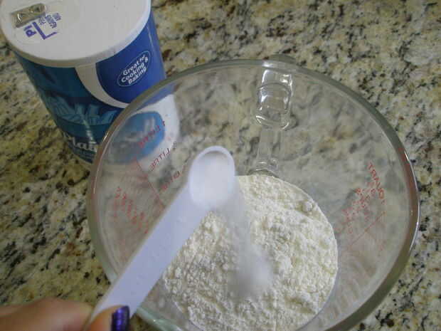 En un tazón grande, combine 3 tazas de harina, sal y 1 cucharada de azúcar. Revuelva con una cuchara de madera para asegurar una distribución uniforme.