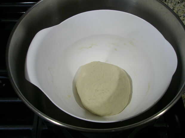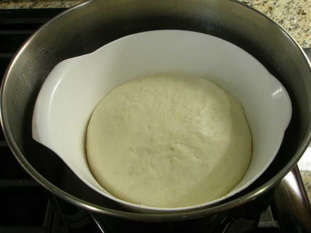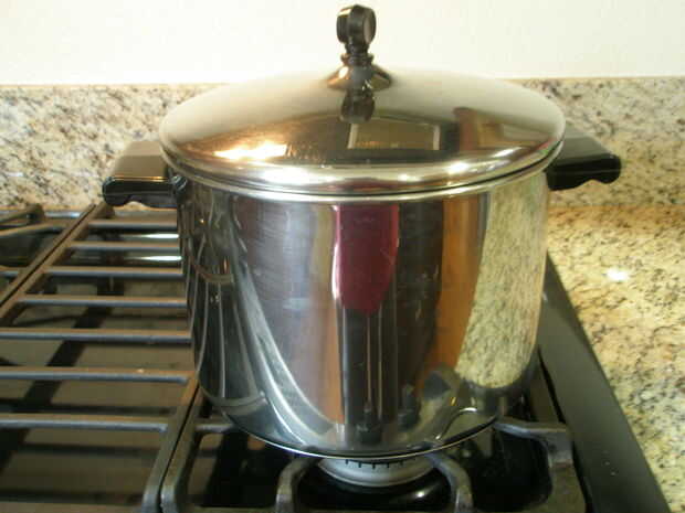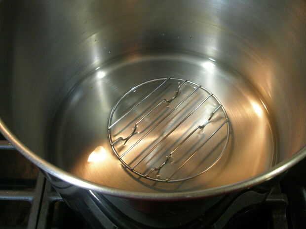 Mayoría de la gente siga los pasos mencionados anteriormente, pero esto es donde se desvían un poco. Crear una pequeña configuración usando una olla grande, un stand de vapor y agua caliente--calentado en la estufa, para crear un ambiente cálido acogedor para la masa. Me Coloque el recipiente que contiene la pasta sobre el soporte de vapor dentro de la olla y cerrar la tapa.