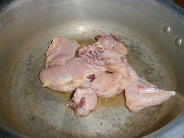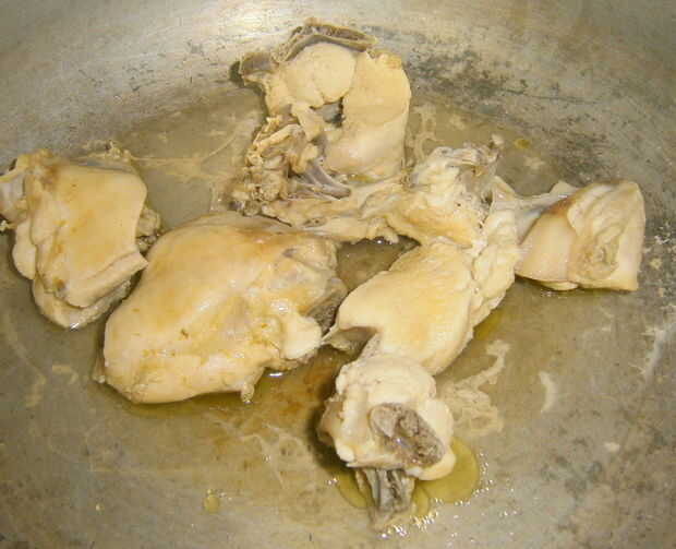 Colocar el pollo limpio y lavado en la olla a presión. Presión cocer hasta que el pollo esté tierno y hecho. Al llegar el olor de la culata o por 10-15 minutos se realizará el pollo. Lo saca de la olla a presión después de que la presión ha sido liberada.