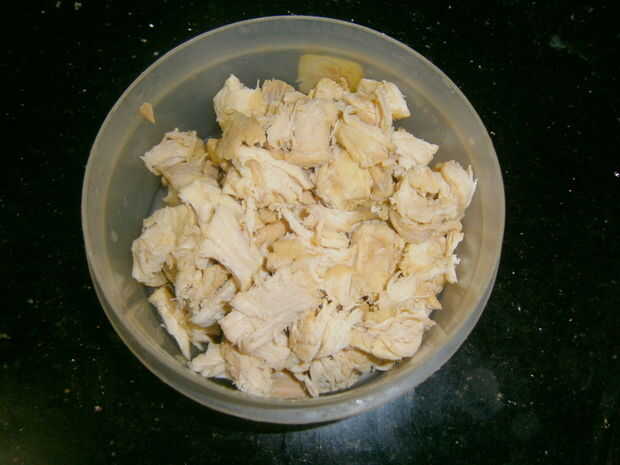 Separar el pollo de los huesos. Desmenuzar el pollo. En un mezclador de picar a una textura gruesa.