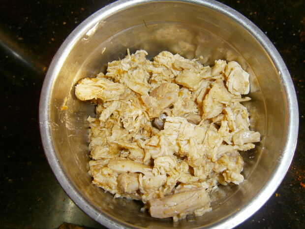 En una sartén calentar aceite. Asar el pollo deshebrado hasta resulta ligero marrón.