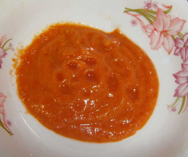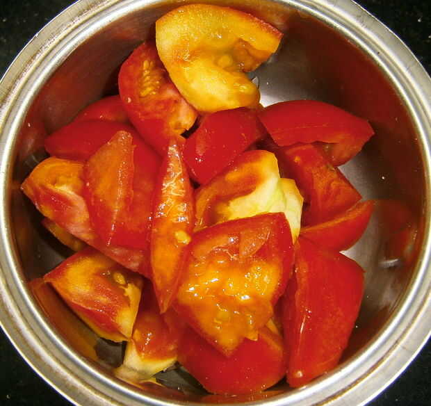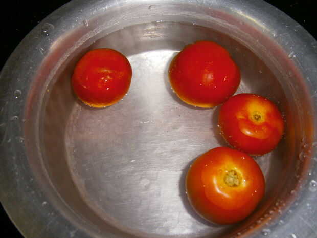 Escaldar el tomate y quitar la piel. En una licuadora/batidora Pure de tomate.