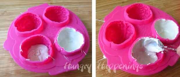 Si su capa de caramelo es muy delgada y piscinas de justo en la parte inferior del molde y no se puede crear una cáscara bastante gruesa hasta alrededor de los bordes del molde, entonces deberás crear dos capas. Añadir la primera capa, luego congele por 3-5 minutos, luego retire del congelador, dejar reposar 5 minutos, luego la segunda capa de pintura.