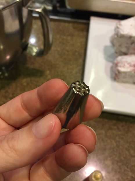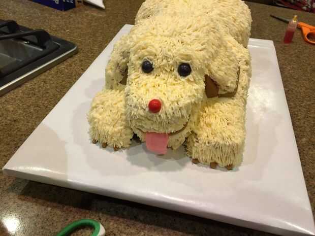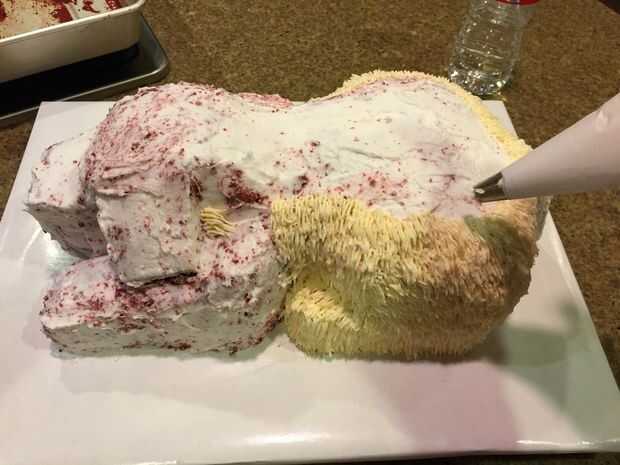 Primero he creado una bolsa de hielo doblando papel de congelador en un cono y luego grabar bien. Cortar el extremo puntiagudo e inserte un pastel decoración de punta en el cono de papel. Utilicé una boquilla de césped Wilton para crear un efecto de piel real. Llené la bolsa con mi color guinda y doblado sobre el extremo abierto cuando estaba lleno. Exprimir Glas "piel" es bastante fácil pero también mucho tiempo. Empiezas en la parte inferior de la torta para que la piel se traslapen como usted trabaja su manera hasta la tarta. Recuerde que pensar acerca de qué manera la piel de un cachorro real sentaría por lo que se puede replicar el patrón de la piel.