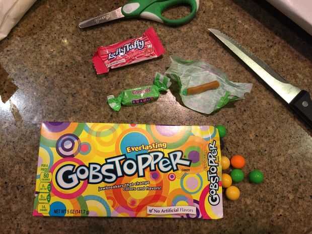 Cuando la piel es completa, uso de caramelo para crear ojos, nariz, lengua, dedos de los pies y las líneas de definición en el pastel. Utilicé restos dulces de Halloween para crear estas características. Sea creativo con los detalles, solía mastica manzana de caramelo el rodillo y formar líneas, rosa Laffy Taffy para una lengua formada y Gobstoppers para ojos y nariz. Podría haber sido fácilmente otros dulces pero me gusta usar lo que tengo. Sólo Recuerde usar adorno comestible, y ser creativos.