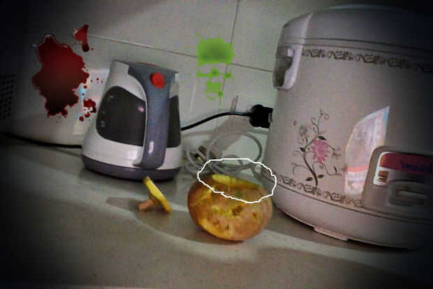 Tomar a regularmente en forma de calabaza y cortar la parte superior un poco como se muestra, después de que saquen todos el relleno pero no tirar el relleno lejos!!!!!! Luego marque los ojos y la boca con un marcador o lápiz, o lápiz, etc.. Nota: Asegúrese que la boca un poco grande. Hacer y tallar uno de los ojos para hacer una cicatriz.