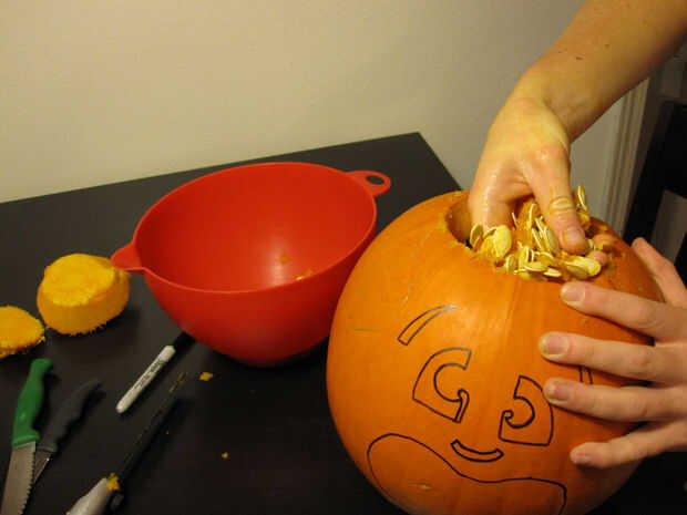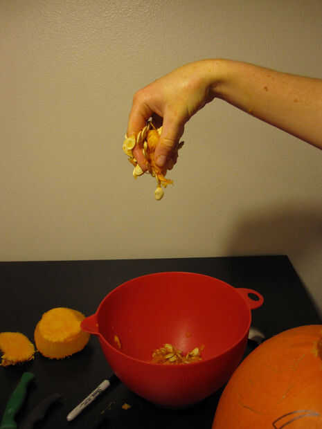 En su lugar, puede utilizar los bits fibrosas y semillas que raspar hacia fuera desde el interior. Son bastante húmedos y rebelde en su propio y cuando que Acomódalos disparos fuera de la calabaza de abierta la boca, puede realmente parecen puke calabaza.