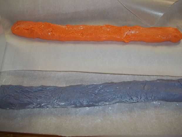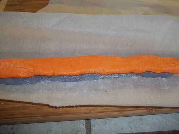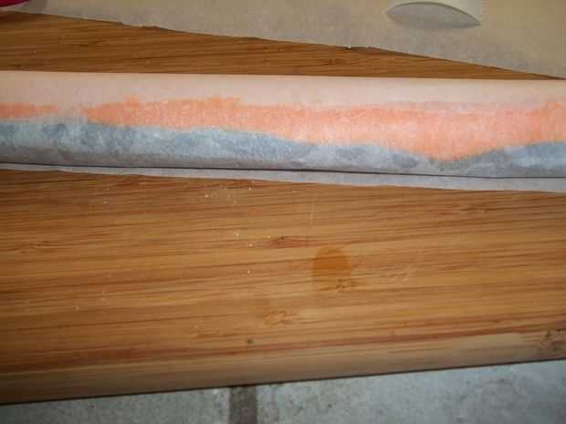 Cepille la parte superior de una de estas cuerdas con una capa de luz de agua y luego coloque la otra cuerda en la parte superior. Presione juntos. Rollo de la doble cuerda gruesa en pergamino, dándole una forma redonda como vas. Coloque en una bandeja y ponerlo en el congelador durante unos minutos endurecerlo para rebanar.