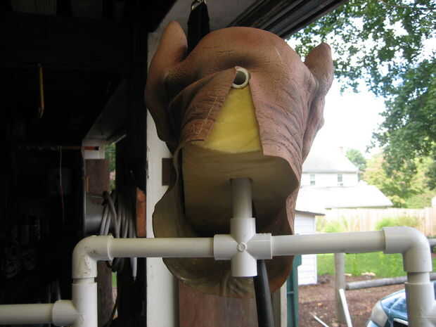 También vaciado un espacio para un pedazo de manguera de la serpiente por lo que fue la salida de su boca. Usé algunos negro manguera automotriz que tenía puesta alrededor. En el extremo le puse una abrazadera de la manguera entonces doblado que se cerró un poco a ensanchar y disipe la corriente de agua.