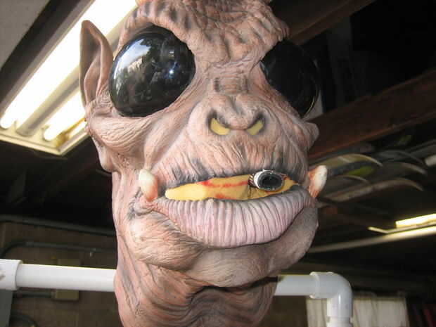 Con una pieza recta de metal percha calienta con un soplete y derretido (ahuecado hacia fuera) un espacio para montar un pedazo de tubo de 1/2 con una conexión de T que tenía trocitos de tubo pega ya en. Esto permite para el montaje de la cabeza a la estructura. Pegué la pieza vertical de la T una vez que tuve la T en la cabeza.