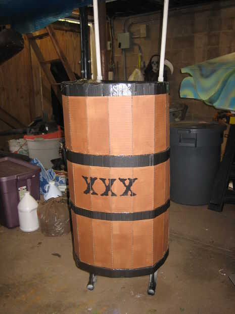 Sólo a partir de la preparación de ventana. Usando hoja de metal que destella y pop remachado a la tubería de pvc. Añadido 4 tiras entonces corte algunos cartulina, tenga cuidado de no cortar a través de todo el camino y clavan a la chapa. Añadido tiras horizontales para parecerse a bandas de metal en un barril de madera. Utiliza una pistola de pegamento caliente para conectarse el cartón de la cartulina.