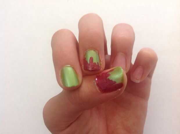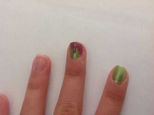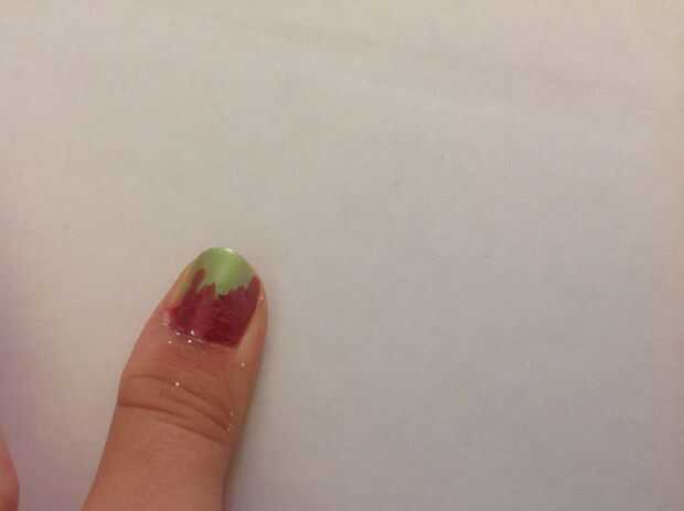 Pintar tus uñas una capa de base Cortar una plantilla de las gotas Coloque la plantilla sobre la uña Pintar las uñas y dejar la plantilla en hasta que el hecho de secado Consejo: Coloque las uñas en agua con hielo para un secado más rápido