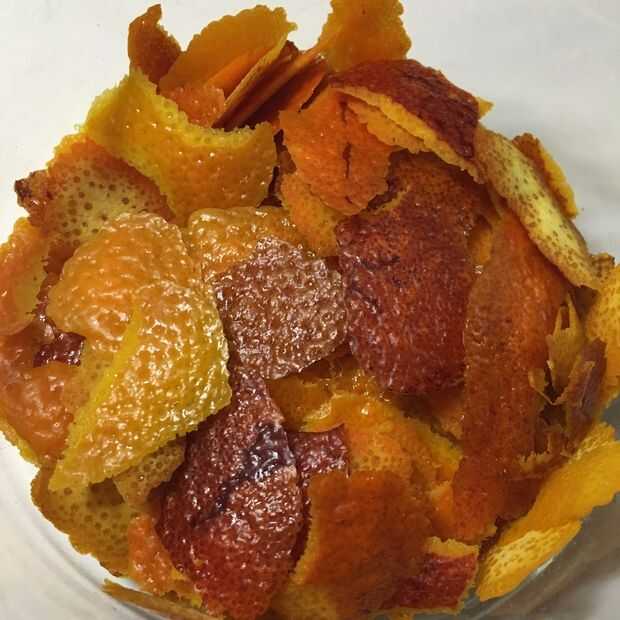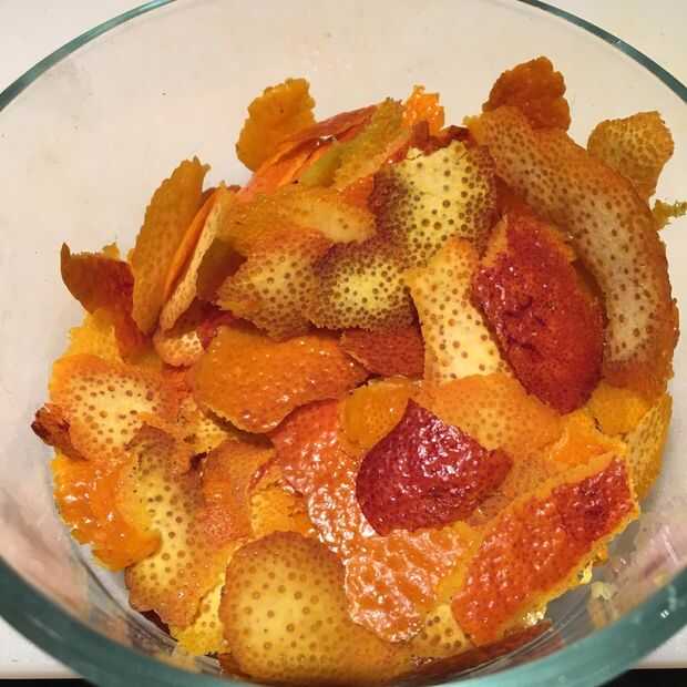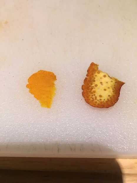 Antes de empezar querrás fregar las naranjas para eliminar cualquier cera sobre la piel. Utilice un cuchillo o pelador de sharp y pelar las naranjas, sólo desea quitar la capa superior de la piel. La segunda imagen muestra dos secciones de la cáscara, la izquierda es cómo desea sus cáscaras para ver. La corteza derecha debe limpiarse para eliminar la médula.