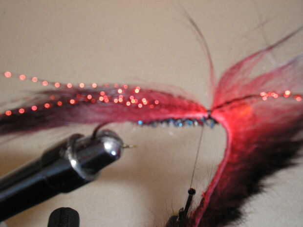 Secure oropel rojo en la parte superior el conejito. La longitud no debe extenderse más allá de la cola de la mosca.