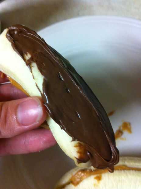 Tomé Nocilla y repartidas en la parte superior del plátano. Tenga cuidado durante este paso o podría terminar consiguiendo todo los dedos y lamerlos :)