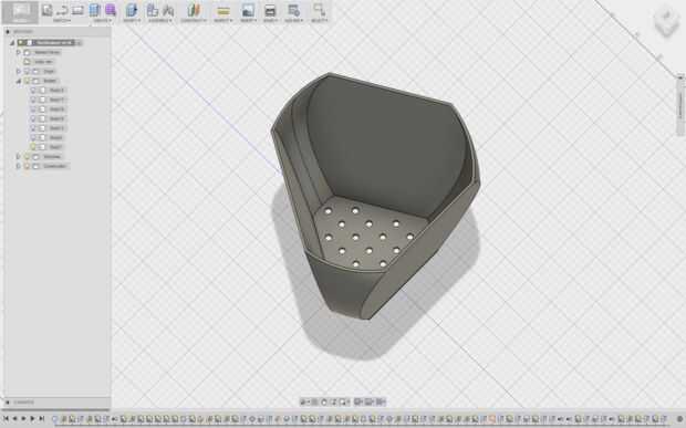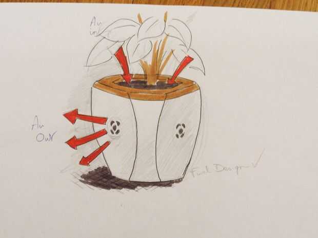 El diseño de contenedores de planta exterior fue diseñado para ocultar e integrar el ventilador y la electrónica. Es por ello que el diseño presenta 3 áreas planas. El patrón de los agujeros para el ventilador se ha repetido en la otra cara con fines estéticos. Se han añadido zonas aisladas para proteger la electrónica de la humedad y agua.