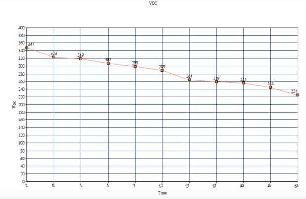 Aquí está la segunda prueba, esta vez con la planta. En una hora la VOC cayó de 323 a VOC tan 99 224!