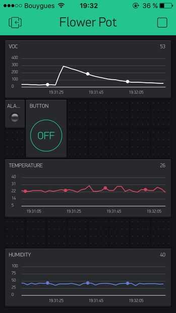 Eso es lo que el proyecto de Kickstarter Blynk! Permite instalar una aplicación para smartphone y conectarlo directamente a su proyecto a través de WIFI o Bluetooth (BETA test). Puede entonces leer los datos de sus sensores e incluso escribir activar cualquier cosa que ha enchufado. En este proyecto, usé la versión gratuita que te permite crear una interfaz de primera con 3 gráficos.
