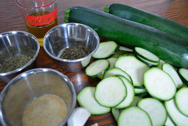 Cortar el calabacín en 3,5 mm rodajas gruesas. Mezclar con las especias y el aceite. Asegúrese de que piezas están cubiertas uniformemente.