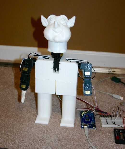 Mi esposa, Annelle, hecho la cabeza de elf con arcilla (que analizado y convertido en un objeto 3d para acoplar a un motor de servo). No sólo crea los caracteres whimsical, pero también trajes y proporciona toques artísticos para la pantalla.