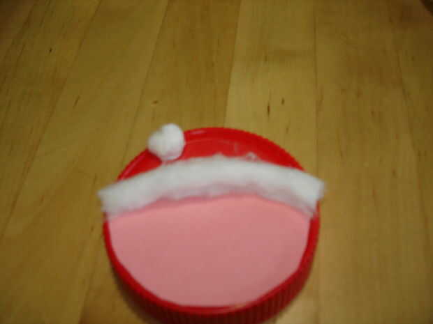Tire un trozo de la bola de algodón para hacer un borde del sombrero. Pegamento en borde superior de la cara de Santa.