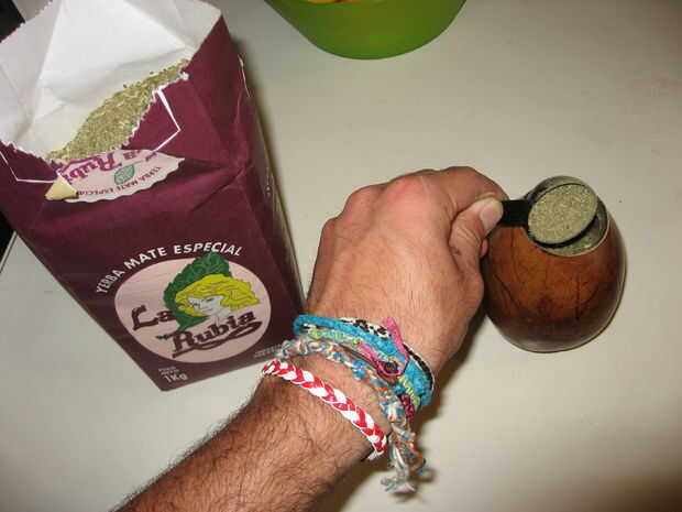 Llene su calabaza seca hacia fuera a cerca de 1/3 de su capacidad con Yerba Mate suelta. Mi calabaza es grande y tarda unos 9 o 10 cucharadas de Mate para llenar 1/3 de la forma.