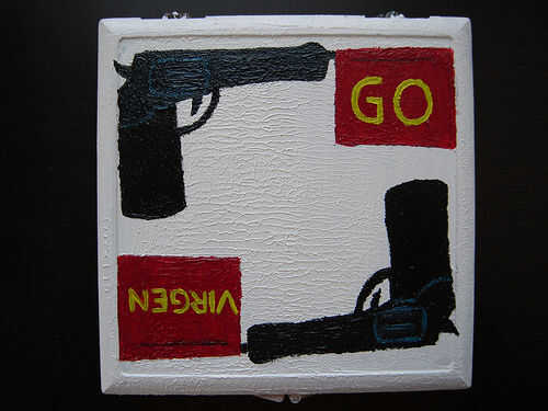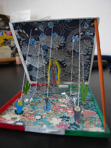 hice este portable pequeño santuario a la Virgen de Guadalupe para una amiga con quien pasé un verano en México. Vivíamos en un pequeño pueblo de Michoacán llamado Santa Clara del Cobre. En Santa Clara del Cobre, vivíamos en una colina. Durante mucho tiempo (me pareció) hubo disparos todas las noches hacia abajo en el pueblo de la Virgen. Así que cada vez que mi amigo y yo oyó el tiroteo criamos nuestros puños y dijo "Vaya Virgen!" ¿Por lo tanto, el arte de la tapa de este proyecto (quizás el tiroteo fue para la Fiesta de la Virgen del Sagraria? Dos primeras semanas de agosto en Santa Clara).