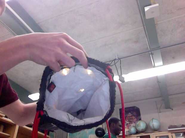 Tomar el más pequeño de los bolsos de 2 lazo. cortó las cuerdas y 4 pequeños agujeros, 1 para cada LED y alimentar al fijador de la batería de 9v a través de la soldadura. luego conecte el circuito a la bolsa.