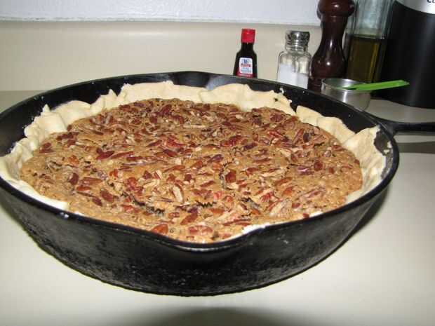 Para empezar, soy una chocoholic y tarda mucho para que me apetecen un postre que no es chocolate de alguna manera. En segundo lugar, personalmente no me gusta mezclar las nueces con mi postre. Puaj!!! Por lo que nunca he pensado ni quería hacer una tarta de nuez, hasta que probé mi novio Pecan Pie mamá. Este genio de una mujer hornea su pastel en una sartén de hierro fundido. Finalmente entendí el término "palmada yo' mamma buena". Realmente quería palmada a la mamá de mi novio porque el pastel era tan delicioso. No sabía qué hacer. Se abstuvo de cualquier tipo de bofetadas porque la mamá de mi novio es más de 6 pies de altura. No es broma. Esta es la tarta más simple y más deliciosa que usted tomará, usted apenas necesitamos una sartén de hierro fundido muy bien condimentada que se ha utilizado desde hace algunas décadas. Tuve que pedir prestado uno del maestro pie a sí misma.