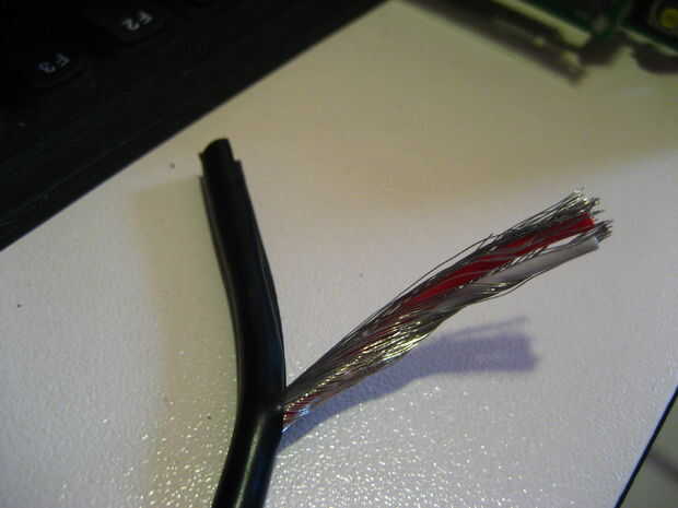 Eliminar cierto aislamiento externo para exponer los cables. GND se envuelve alrededor sin más aislamiento, + 5V es el blanco + 12V es el rojo. Asegúrate de que comprobar con un multímetro en cada tensión en realidad es! Nunca se sabe.