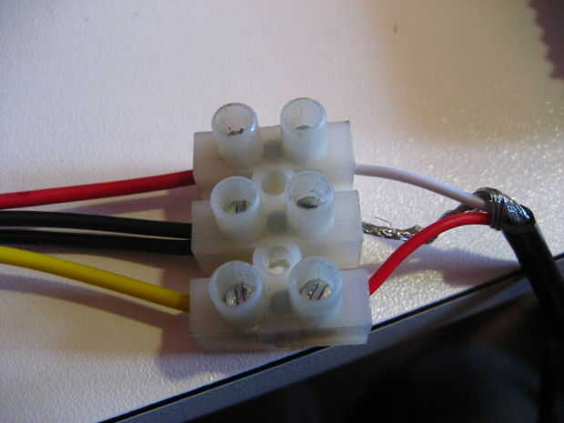 Ahora simplemente atornillarlos en la terminal de tierra con dos cables negros, cable blanco con cable rojo, cable rojo con cable amarillo.