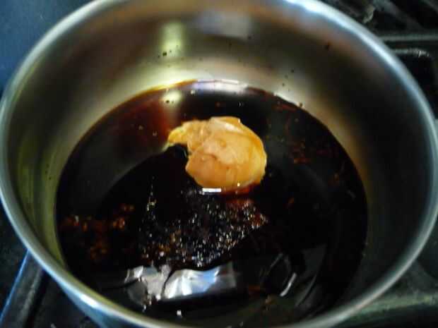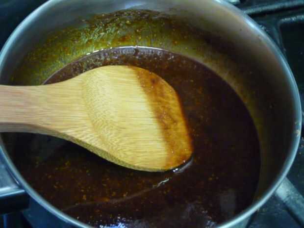 Poner el ajo rallado, pimiento rojo, pimiento Serrano, salsa de soja, miel, vinagre, aceite de sésamo en una cacerola pequeña a fuego medio. Revuelva para combinar.